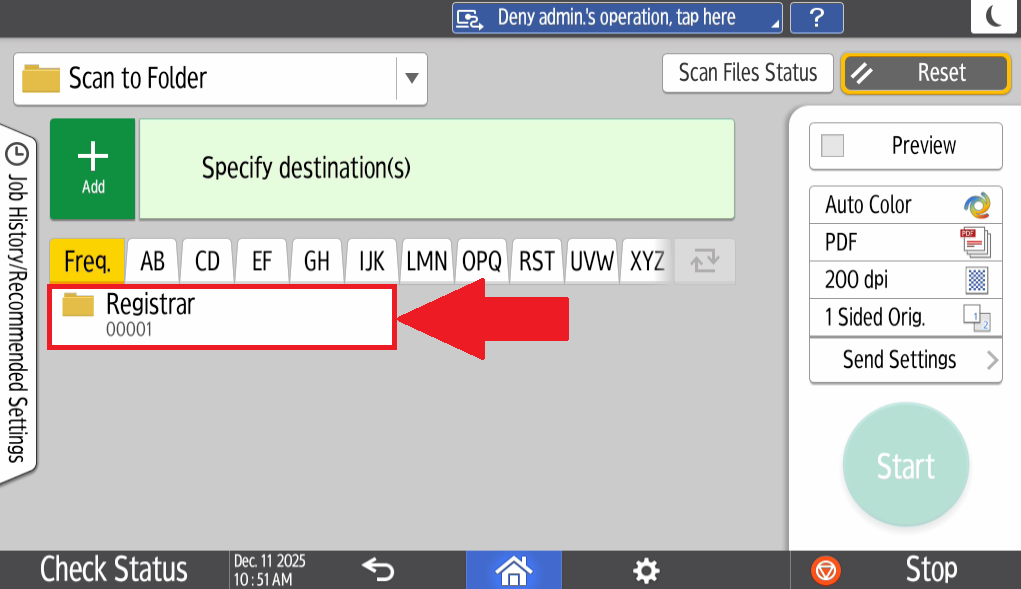 - Load the document and Select Start to scan the document to the selected Network Folder