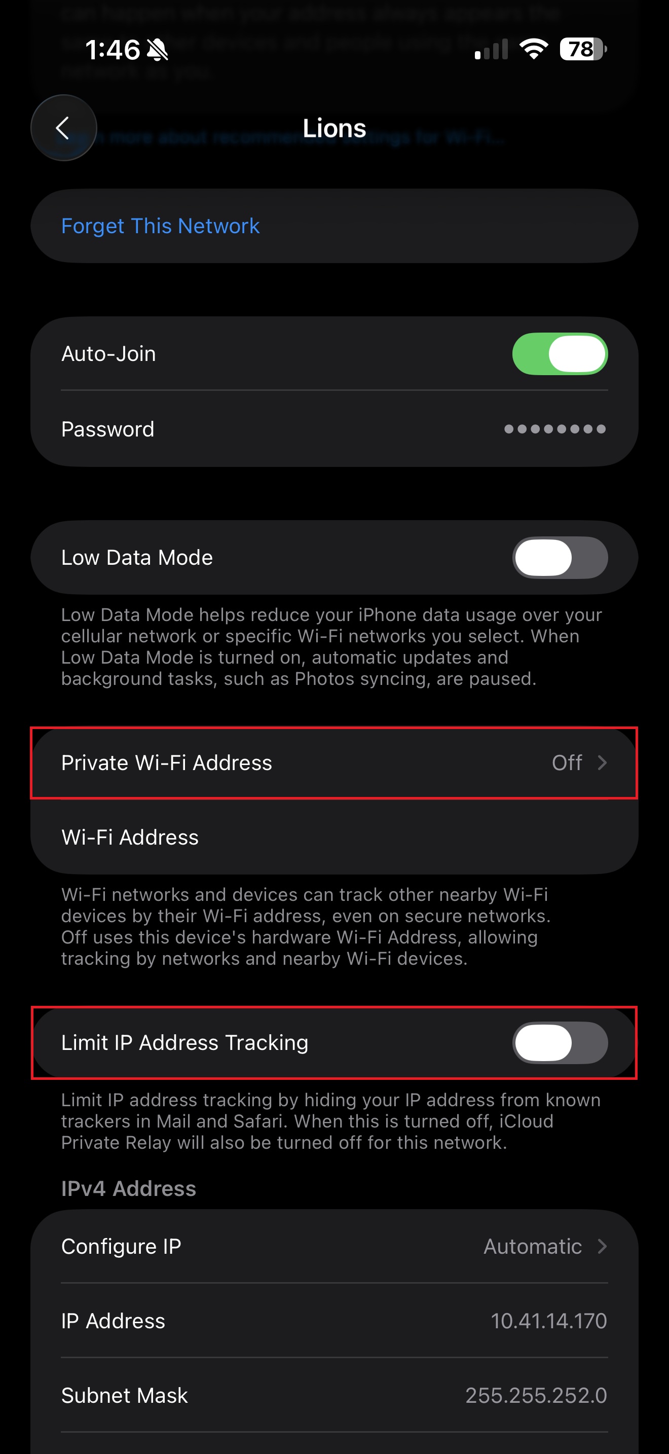 - Connect to the desired Wi-Fi network, then tap the info 'i' icon next to Lions